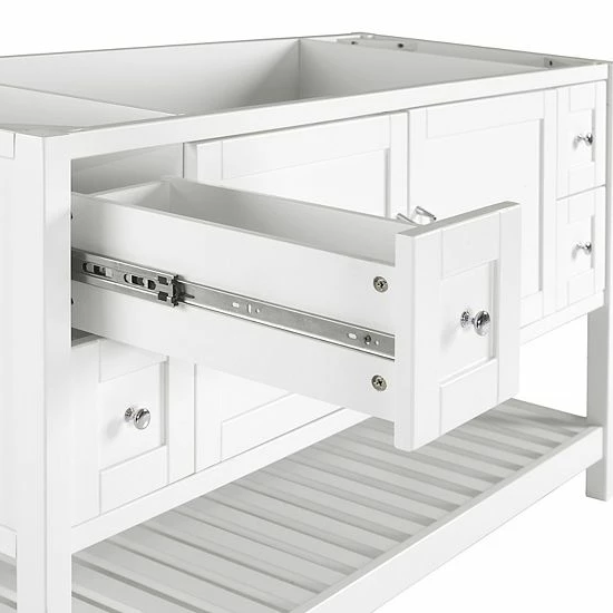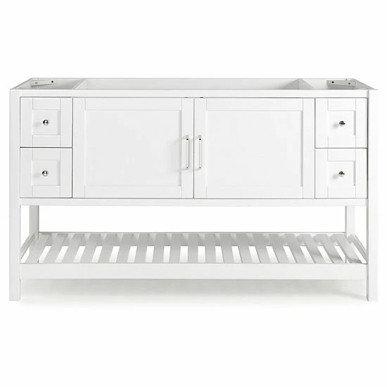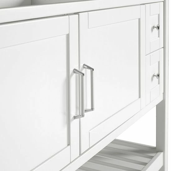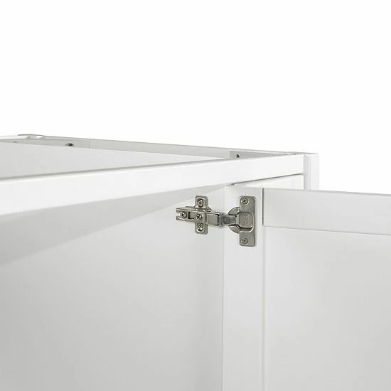 - Soft-close doors and drawers, nickel hardware, adjustable height levelers
