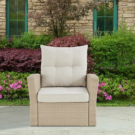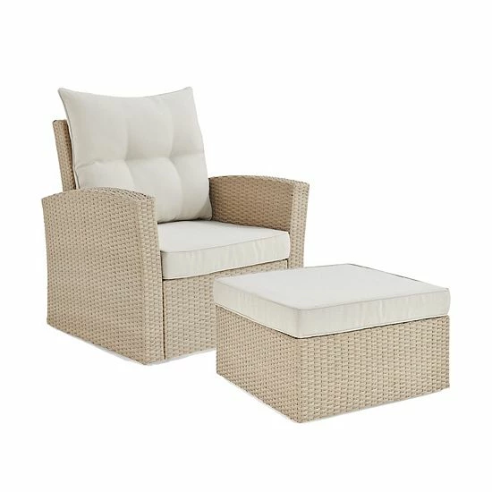Your guests will love to relax with this Alaterre Furniture Canaan All-Weather Wicker Outdoor Chair & Ottoman 4-piece Set on your patio.